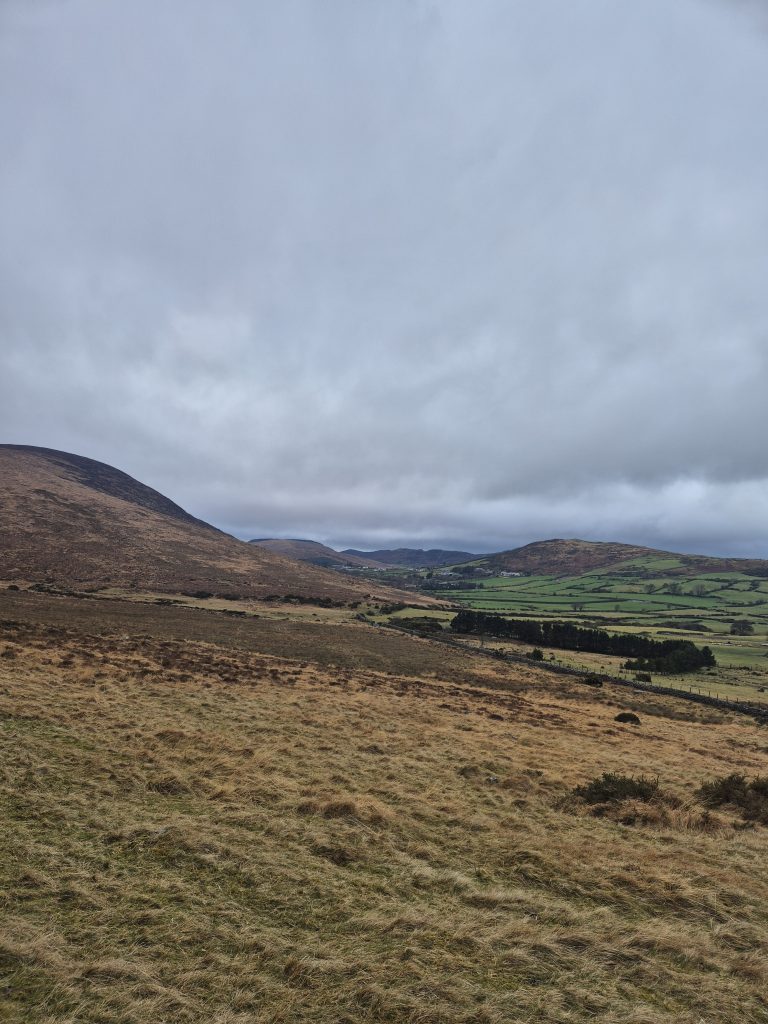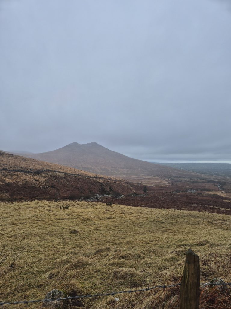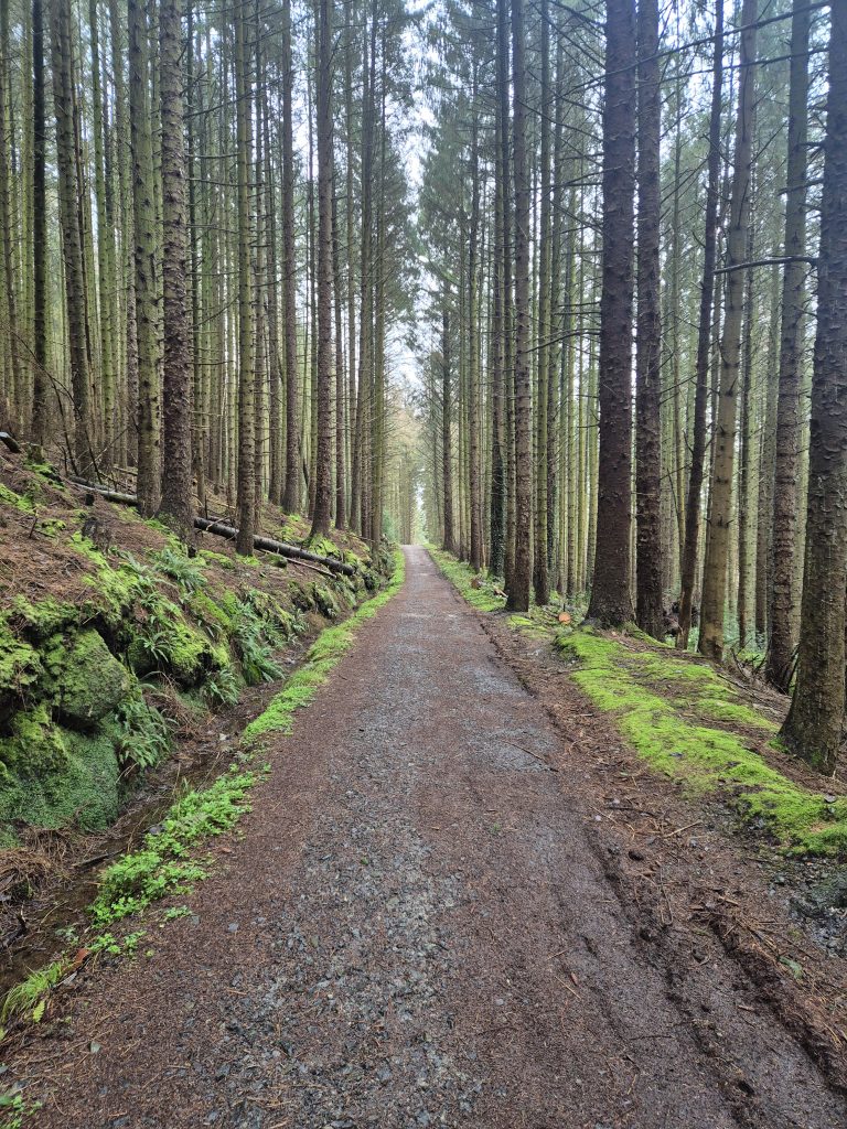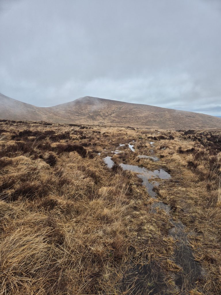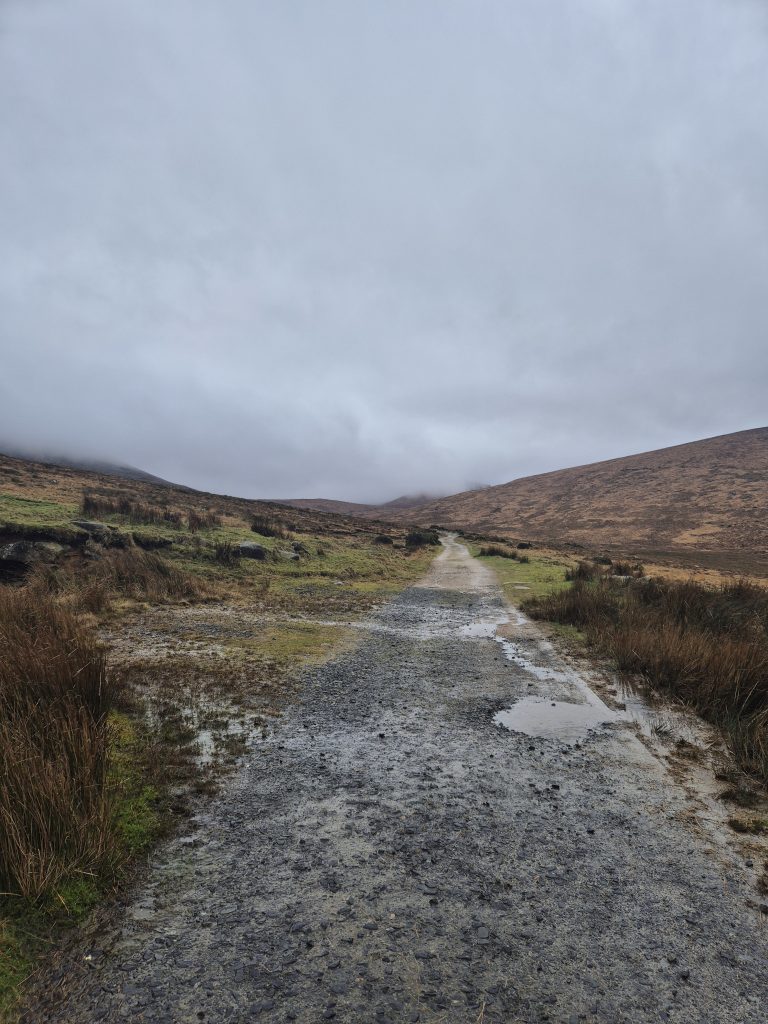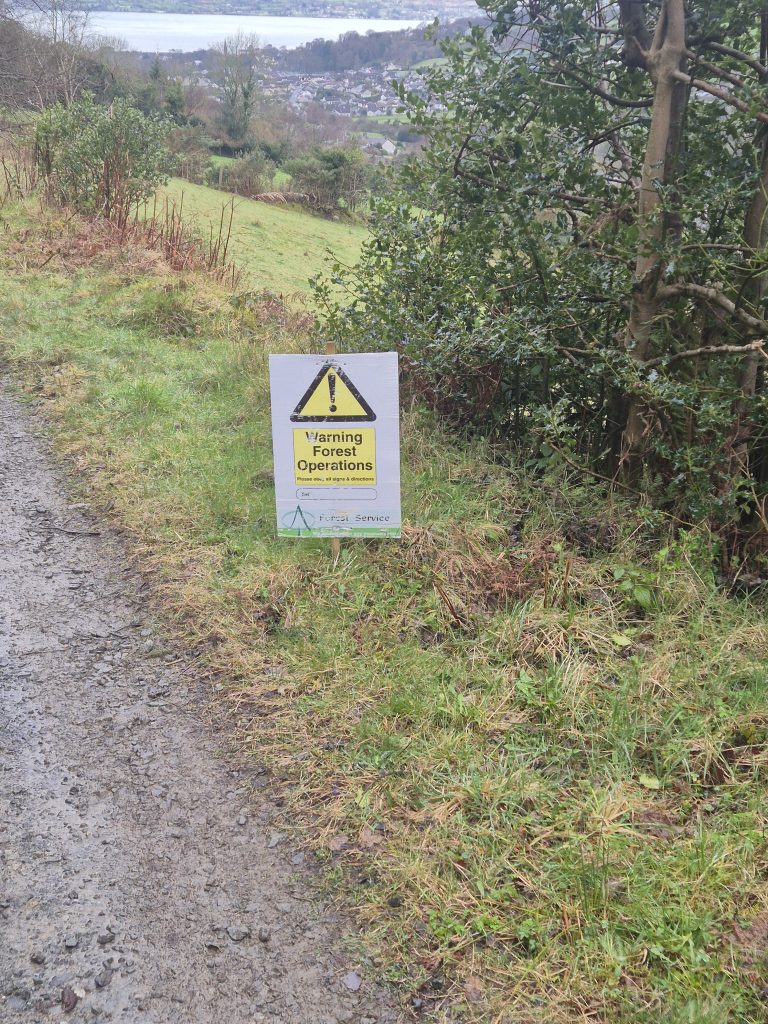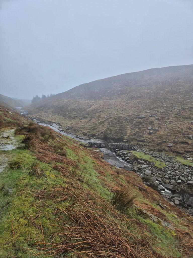Hen mountain in the mist but today no climbing, just a partial circumnavigation.The headwaters of the Bann and it is wet and muddy and slippery.Back towards Splega and the jacknifed truck that caused some issues.Squelchy boots but a bit of hard track – bliss.The view down to the Kilbroney river but not for me yet.Hen mountain from the other side. That is not a stream – that is the path.Down this other very dry path across the river and up to that saddle to the left of that peak.OK I might have a bit of trouble coming.At least this one has a bridge across, the last one was hairrrri.Oh dear! Hope this doesn’t get worse. Nearly up the other side.Hurrah! Over the top and down to the green fields. Puffing or what.Miles of the Rostrevor forest now. At least it’s dry – ish.Some local went to a bit of trouble.Rostrevor and down to the sea, the sea, the sparkling beautiful sea. But miles still to go.Indeed, they have been repairing the path …… but it claimed a dedicated worker in the process.A lovely ancient Oak …… straight out of Games of Thones, though it looks a bit like the Grinch as opposed to the Old Gods.