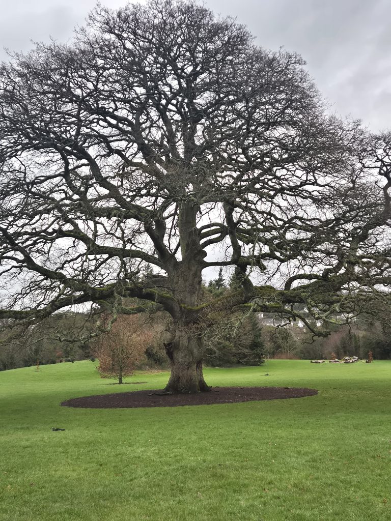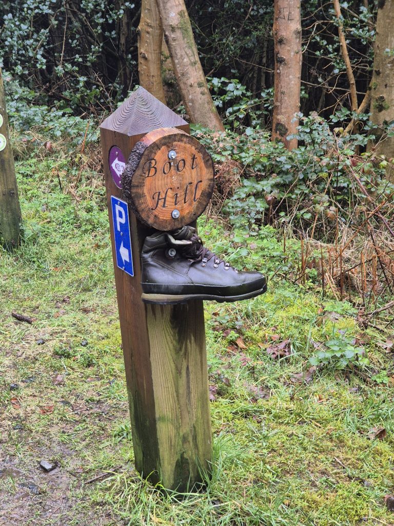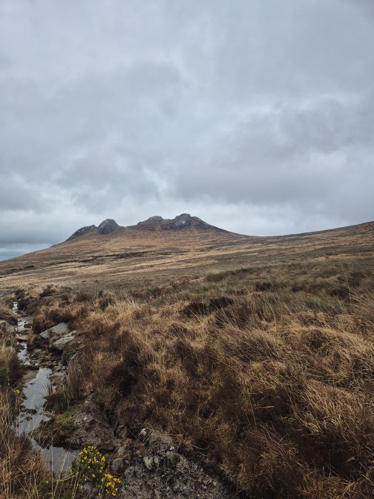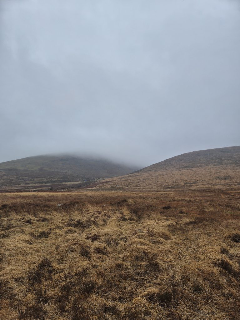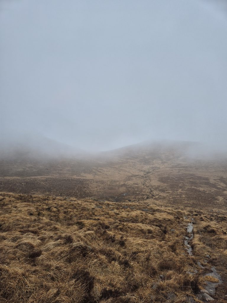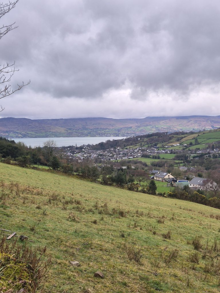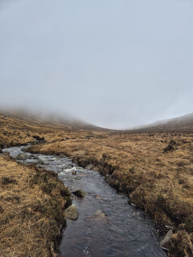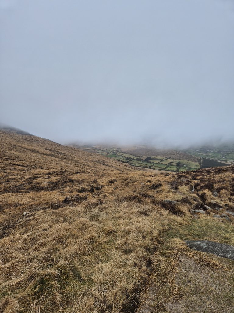 Hen mountain in the mist but today no climbing, just a partial circumnavigation.The headwaters of the Bann and it is wet and muddy and slippery.Back towards Splega and the jacknifed truck that caused some issues.Squelchy boots but a bit of hard track – bliss.The view down to the Kilbroney river but not for me yet.Hen mountain from the other side. That is not a stream – that is the path.Down this other very dry path across the river and up to that saddle to the left of that peak.OK I might have a bit of trouble coming.At least this one has a bridge across, the last one was hairrrri.Oh dear! Hope this doesn’t get worse. Nearly up the other side.Hurrah! Over the top and down to the green fields. Puffing or what.Miles of the Rostrevor forest now. At least it’s dry – ish.Some local went to a bit of trouble.Rostrevor and down to the sea, the sea, the sparkling beautiful sea. But miles still to go.Indeed, they have been repairing the path …… but it claimed a dedicated worker in the process.A lovely ancient Oak …… straight out of Games of Thones, though it looks a bit like the Grinch as opposed to the Old Gods.